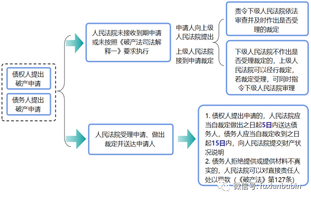 根據(jù)《破產(chǎn)法解釋(一)》第7條、第9條和《企業(yè)破產(chǎn)法》第10條的規(guī)定,人民法院收到破產(chǎn)申請時,應(yīng)當(dāng)向申請人出具收到申請及所附證據(jù)的書面憑證,人民法院收到破產(chǎn)申請后應(yīng)當(dāng)及時對申請人的主體資格、債務(wù)人的主體資格和破產(chǎn)原因,以及有關(guān)材料和證據(jù)等進(jìn)行審查,并依據(jù)破產(chǎn)企業(yè)法第10條的規(guī)定作出是否受理,人民法院認(rèn)為申請人應(yīng)當(dāng)補充、補正相關(guān)材料的,應(yīng)當(dāng)自收到破申請之日起五日告知申請人。當(dāng)事人補充、補正相關(guān)材料的期限不計入期限。如果申請人向人民法院提出破產(chǎn)申請,人民法院未接收到期申請,或者未按照《破產(chǎn)法司法解釋(一)》第七條規(guī)定執(zhí)行的,申請人可以向上一級人民法院提出破產(chǎn)申請,上一級人民法院接到破產(chǎn)申請后,應(yīng)當(dāng)責(zé)令下級人民法院依法審查并及時作出是否受理的裁定,下級人民法院仍不作出是否受理裁定的,上一級人民法院可以徑行作出裁定,上一級人民法院裁定受理破產(chǎn)申請的,可以同時指令下級人民法院審理該案件。