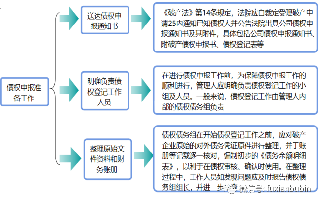 根據(jù)《企業(yè)破產(chǎn)法》第14條、45條、49條、57條等相關(guān)規(guī)定,自人民法院發(fā)布受理破產(chǎn)申請公告之日起計算,最短不得少于30日,最長不得超過3個月應(yīng)完成如下工作,一是送達(dá)債權(quán)申報通知書。人民法院應(yīng)自裁定受理破產(chǎn)申請之日起25日之內(nèi)通知已知債權(quán)人,并予以公告。通知和公告應(yīng)載明:申請人、被申請人的名稱或姓名,人民法院受理破產(chǎn)申請的時間,申報債權(quán)的期限、地點和注意事項;管理人的名稱或姓名及其他處理事務(wù)的地址;債務(wù)人或財產(chǎn)持有人應(yīng)當(dāng)向管理人清償債務(wù)或交付財產(chǎn)的要求,第一次債權(quán)人會議召開的時間和地點;人民法院認(rèn)為應(yīng)當(dāng)通知和公告的其他事項等;二是明確負(fù)責(zé)債權(quán)登記的工作人員;三是明確債權(quán)申報向管理人提交的材料,具體包括填寫完畢的管理人提供的債權(quán)申報書、債權(quán)登記申報表、證明債權(quán)人資格的身份證明,證明債權(quán)存在的材料,說明債權(quán)數(shù)額,有無擔(dān)保的證據(jù)材料,說明債權(quán)性質(zhì)的材料;四是整理原始文件資料和財務(wù)賬冊。