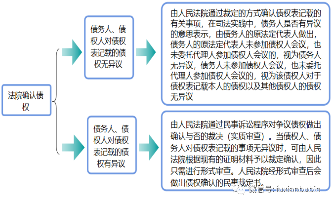 根據(jù)《企業(yè)破產(chǎn)法》第58條,《破產(chǎn)法司法解釋(三)》規(guī)定,法院確認(rèn)債權(quán)的工作主要集中在如下幾個方面:一是債務(wù)人、債權(quán)人對債權(quán)表記載的債權(quán)無異議時,由人民法院通過裁定的方式確認(rèn)債權(quán)表記載的有關(guān)事項;二是已經(jīng)生效法律文書確定的債權(quán),管理人應(yīng)當(dāng)予以確認(rèn)。管理人認(rèn)為債權(quán)人據(jù)以申報債權(quán)的生效法律文書確定的債權(quán)錯誤,或者有證據(jù)證明債權(quán)人與債務(wù)人惡意通過訴訟、仲裁或者公證機(jī)關(guān)賦予強制執(zhí)行力公證文書的形式虛構(gòu)債權(quán)債務(wù)的,應(yīng)當(dāng)依法通過審判監(jiān)督程序向作出該判決、裁定、調(diào)解書的人民法院或者上一級人民法院申請撤銷生效法律文書,或者向受理破產(chǎn)申請的人民法院申請撤銷或者不予執(zhí)行仲裁裁決、不予執(zhí)行公證債權(quán)文書后,重新確定債權(quán);三是在債務(wù)人、債權(quán)人對債權(quán)表記載的債權(quán)有異議時,由人民法院通過民事訴訟程序?qū)幾h債權(quán)做出確認(rèn)與否的裁決(實質(zhì)審查)。當(dāng)債權(quán)人、債務(wù)人對債權(quán)表記載的事項無異議時,可由人民法院根據(jù)現(xiàn)有的證明材料予以裁定確認(rèn),因此只需進(jìn)行形式審查。