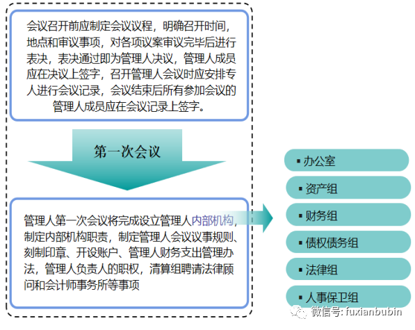 三是在管理人第一次會議討論設(shè)立管理人內(nèi)部職能機(jī)構(gòu),正常情況下,在管理人內(nèi)常設(shè)立的職能機(jī)構(gòu)包括辦公室、資產(chǎn)組、財務(wù)組、債權(quán)債務(wù)組、法律組、人事保衛(wèi)組,并對每個職能部門的職責(zé)予以明確,使各個職能機(jī)構(gòu)之間進(jìn)行有效分工;