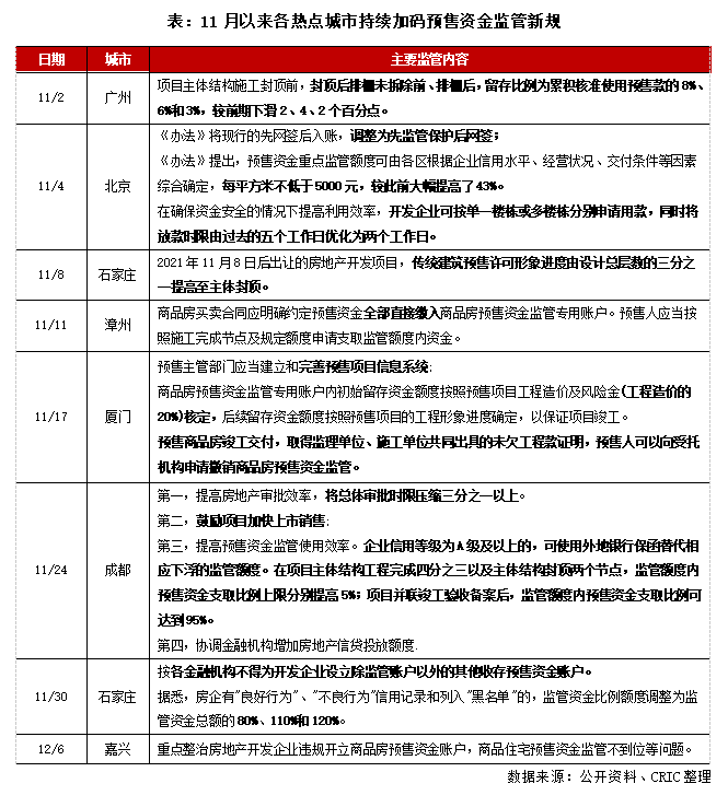 此外,雖然居民按揭端邊際放松,但后續(xù)傳導(dǎo)至房企資金端仍面臨阻力。二季度以來(lái)民營(yíng)房企信用風(fēng)險(xiǎn)加速暴露,出于“保民生、保交樓、保穩(wěn)定”的考慮,11月北京、成都、石家莊、廈門(mén)、漳州和廣州等城陸續(xù)發(fā)布升級(jí)版預(yù)售資金監(jiān)管規(guī)定。從各地預(yù)售資金監(jiān)管政策的變化來(lái)看,主要從“提高資金監(jiān)管的監(jiān)管額度”、“調(diào)整入賬管理模式,先監(jiān)管后網(wǎng)簽”以及“加強(qiáng)分類(lèi)監(jiān)管”等手段來(lái)保障預(yù)售資金的安全。