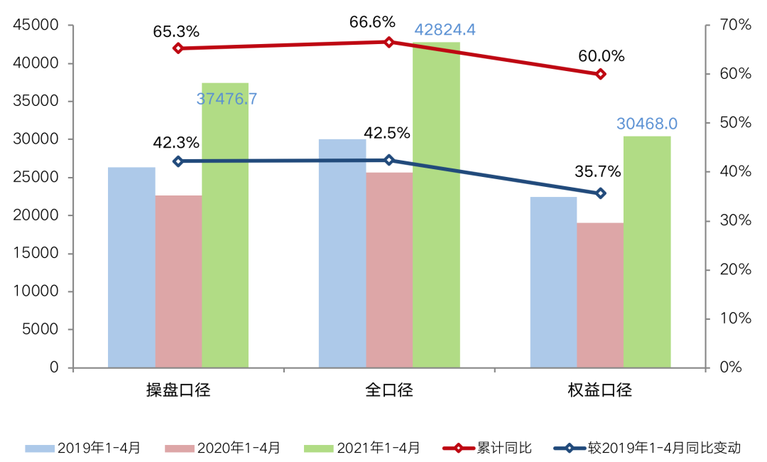 從前4月累計銷售操盤金額來看,1-4月,百強房企整體的業(yè)績規(guī)模同比增長65.3%,較2019年同期也增長近42.3%。1-4月百強房企全口徑銷售金額更是達到了42824.4億元,同比增長66.6%。