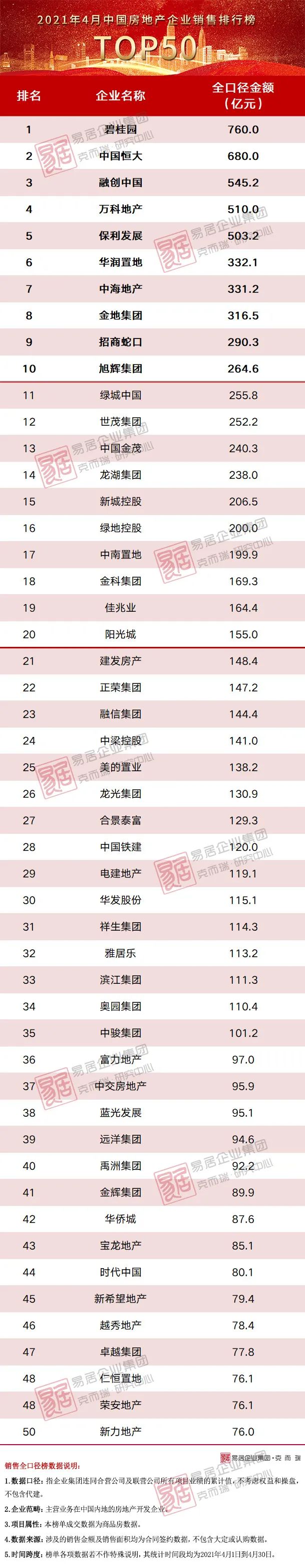 此外,1-4月已有7家房企銷售操盤金額突破千億元,比2020年同期增加了4家;若以全口徑銷售金額計算,千億陣營已達9家,比2020年同期增加了5家。