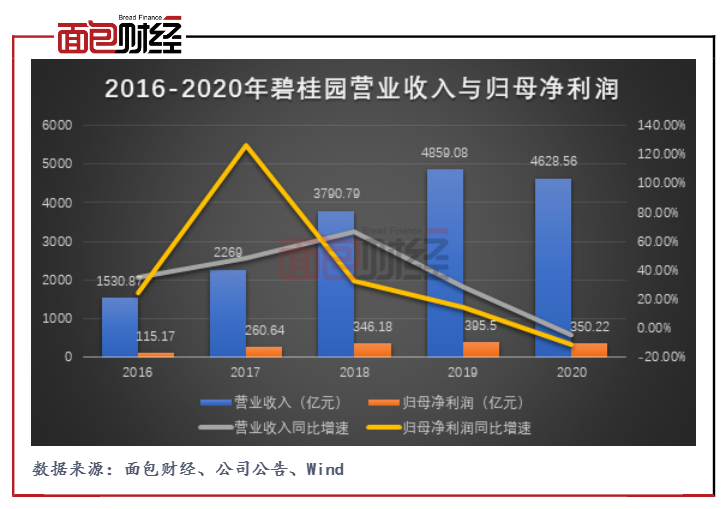 受此影響,碧桂園營收、歸母凈利潤12年以來首度同時(shí)下滑。公司2020年實(shí)現(xiàn)營業(yè)收入4628.56億元,同比降低4.74%;實(shí)現(xiàn)歸母凈利潤350.22億元,同比降低11.45%。