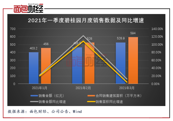 此外,碧桂園公布了2021年一季度銷售數(shù)據(jù)。公司2021年1-3月累計(jì)月銷額、月銷面積分別為1395.6億元、1576萬平方米,同比分別增長38.34%、31.11%。