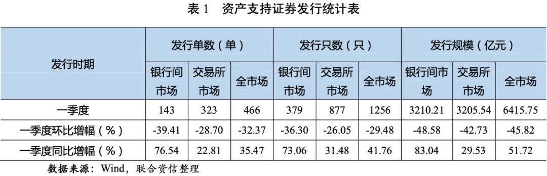 分市場(chǎng)看,2021年一季度,銀行間市場(chǎng)共發(fā)行143單379只資產(chǎn)支持證券,發(fā)行規(guī)模為3210.21億元,發(fā)行單數(shù)、只數(shù)和規(guī)模環(huán)比均大幅下降,同比均有所增長(zhǎng);交易所市場(chǎng)共發(fā)行323單877只資產(chǎn)支持證券,發(fā)行規(guī)模為3205.54億元,發(fā)行單數(shù)、只數(shù)和規(guī)模環(huán)比均大幅下降但同比均有所增長(zhǎng)(見(jiàn)表1)。總體看,銀行間市場(chǎng)的發(fā)行同比增幅明顯高于交易所市場(chǎng),主要源于銀行間市場(chǎng)應(yīng)收票據(jù)和個(gè)人住房抵押貸款等資產(chǎn)支持證券發(fā)行量上升所致。
