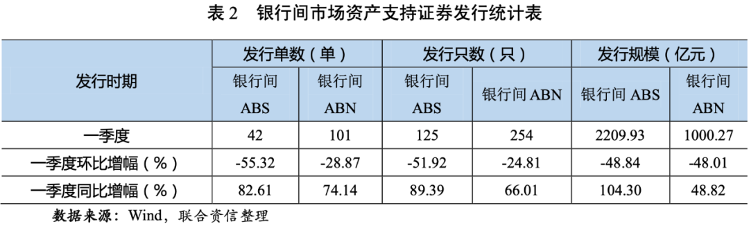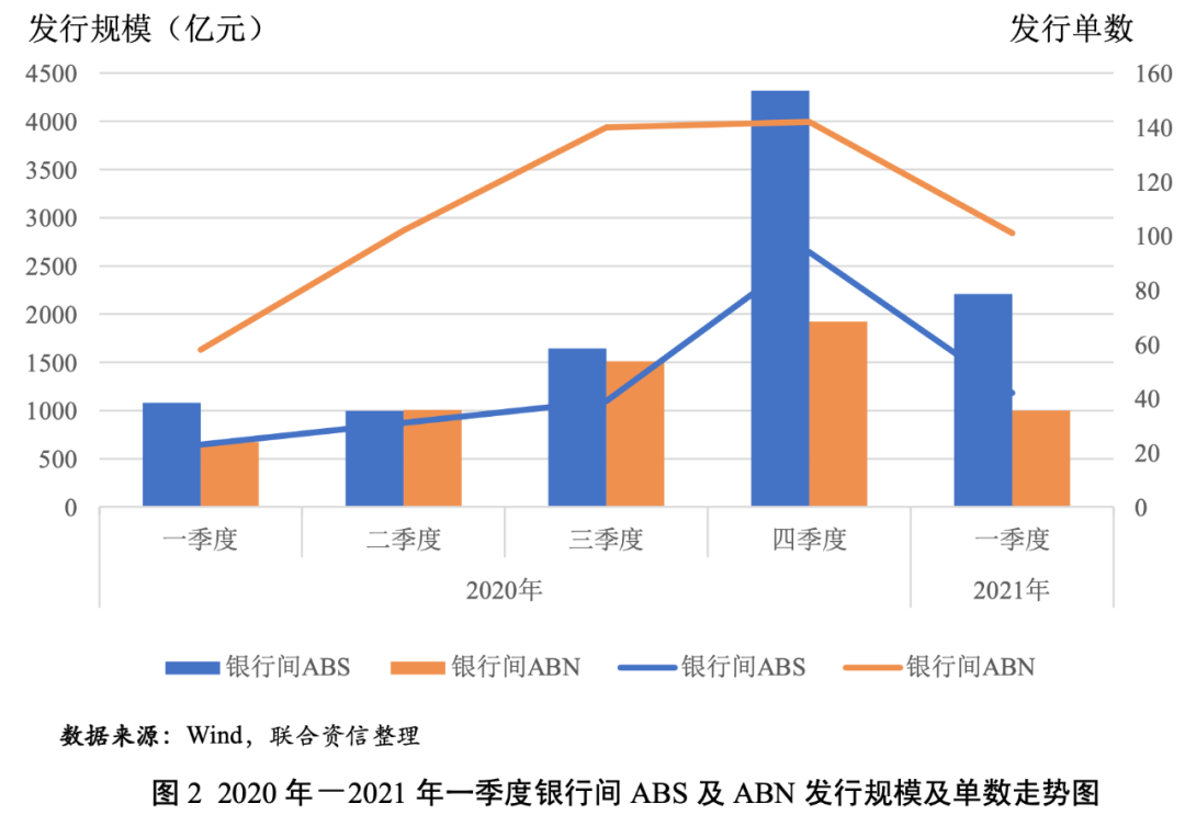 從銀行間市場(chǎng)來(lái)看,2021年一季度,信貸資產(chǎn)支持證券(以下簡(jiǎn)稱(chēng)“銀行間ABS”)共發(fā)行42單125只,發(fā)行規(guī)模為2209.93億元,發(fā)行單數(shù)、只數(shù)和規(guī)模環(huán)比均有所下降,同比均有所上升;銀行間資產(chǎn)支持票據(jù)(以下簡(jiǎn)稱(chēng)“銀行間ABN”)共發(fā)行101單254只,發(fā)行規(guī)模為1000.27億元,發(fā)行單數(shù)、只數(shù)和規(guī)模環(huán)比均有所下降,同比均大幅增長(zhǎng)(見(jiàn)表2和圖2)。總體看,一季度銀行間ABS發(fā)行單數(shù)、只數(shù)和規(guī)模同比增幅較銀行間ABN更高。一季度銀行間市場(chǎng)出現(xiàn)創(chuàng)新產(chǎn)品類(lèi)型,如國(guó)網(wǎng)租賃發(fā)行了全國(guó)首單綠色碳中和資產(chǎn)支持商業(yè)票據(jù)(ABCP),實(shí)現(xiàn)了綠色金融模式的創(chuàng)新,為引導(dǎo)產(chǎn)業(yè)結(jié)構(gòu)、能源結(jié)構(gòu)向綠色低碳轉(zhuǎn)型,提供了有力的金融支持。