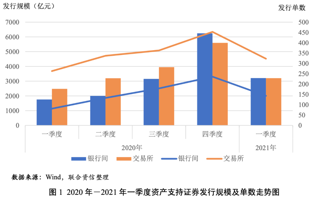 2021年一季度,資產(chǎn)支持證券發(fā)行環(huán)比有所下降,同比顯著上升[2]。具體來(lái)看,2021年一季度,我國(guó)債券市場(chǎng)共發(fā)行466單1256只資產(chǎn)支持證券,發(fā)行單數(shù)和只數(shù)環(huán)比分別下降32.37%和29.48%,同比分別上升35.47%和41.76%;發(fā)行規(guī)模為6415.75億元,環(huán)比下降45.82%,同比大幅增加51.72%。整體看,受季節(jié)性因素影響,一季度資產(chǎn)支持證券發(fā)行單數(shù)、只數(shù)和規(guī)模環(huán)比有所下降,但在新冠疫情得到控制后實(shí)體經(jīng)濟(jì)恢復(fù)發(fā)展融資需求強(qiáng)烈的背景下,一季度資產(chǎn)支持證券發(fā)行單數(shù)、只數(shù)和規(guī)模同比大幅增加。