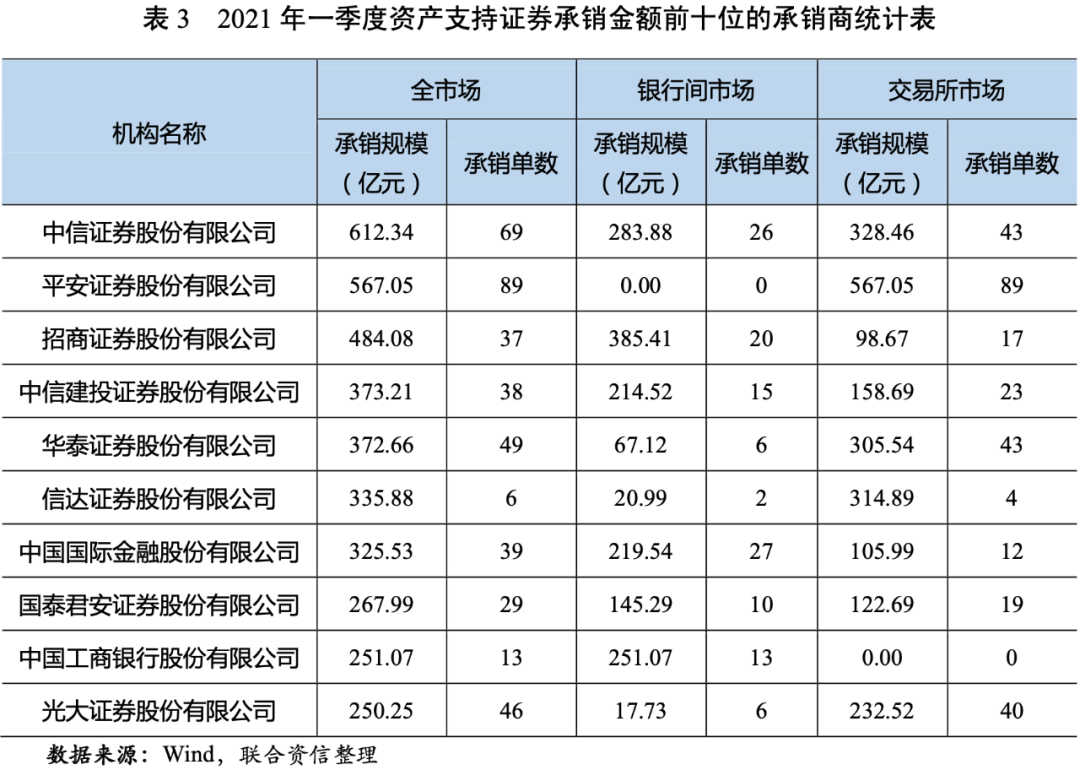 從資產(chǎn)支持證券的承銷(xiāo)情況來(lái)看,2021年一季度,中信證券股份有限公司、平安證券股份有限公司和招商證券股份有限公司的承銷(xiāo)金額位居前三;平安證券股份有限公司的承銷(xiāo)單數(shù)位居第一,中信證券股份有限公司和華泰證券股份有限公司的承銷(xiāo)單數(shù)分別排名第二位和第三位。