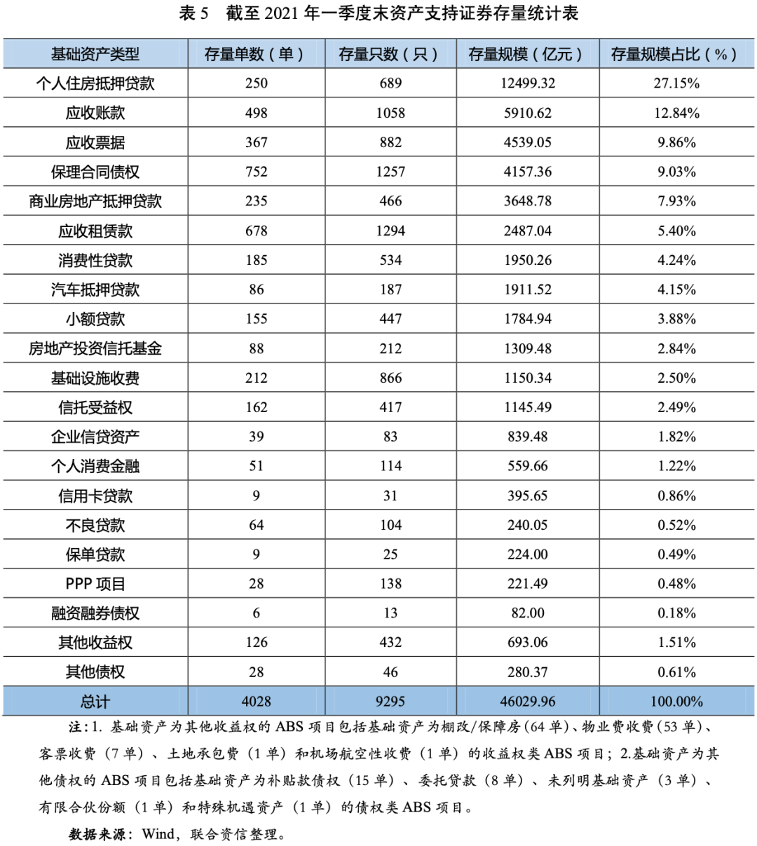 截至2021年一季度末,債券市場(chǎng)上共有4028單9295只資產(chǎn)支持證券存續(xù),本金存量規(guī)模為46029.96億元。從存量規(guī)模占比來(lái)看,前五大基礎(chǔ)資產(chǎn)類(lèi)型分別為個(gè)人住房抵押貸款(27.15%)、應(yīng)收賬款(12.84%)、應(yīng)收票據(jù)(9.86%)、保理合同債權(quán)(8.91%)和商業(yè)房地產(chǎn)抵押貸款(7.93%)。