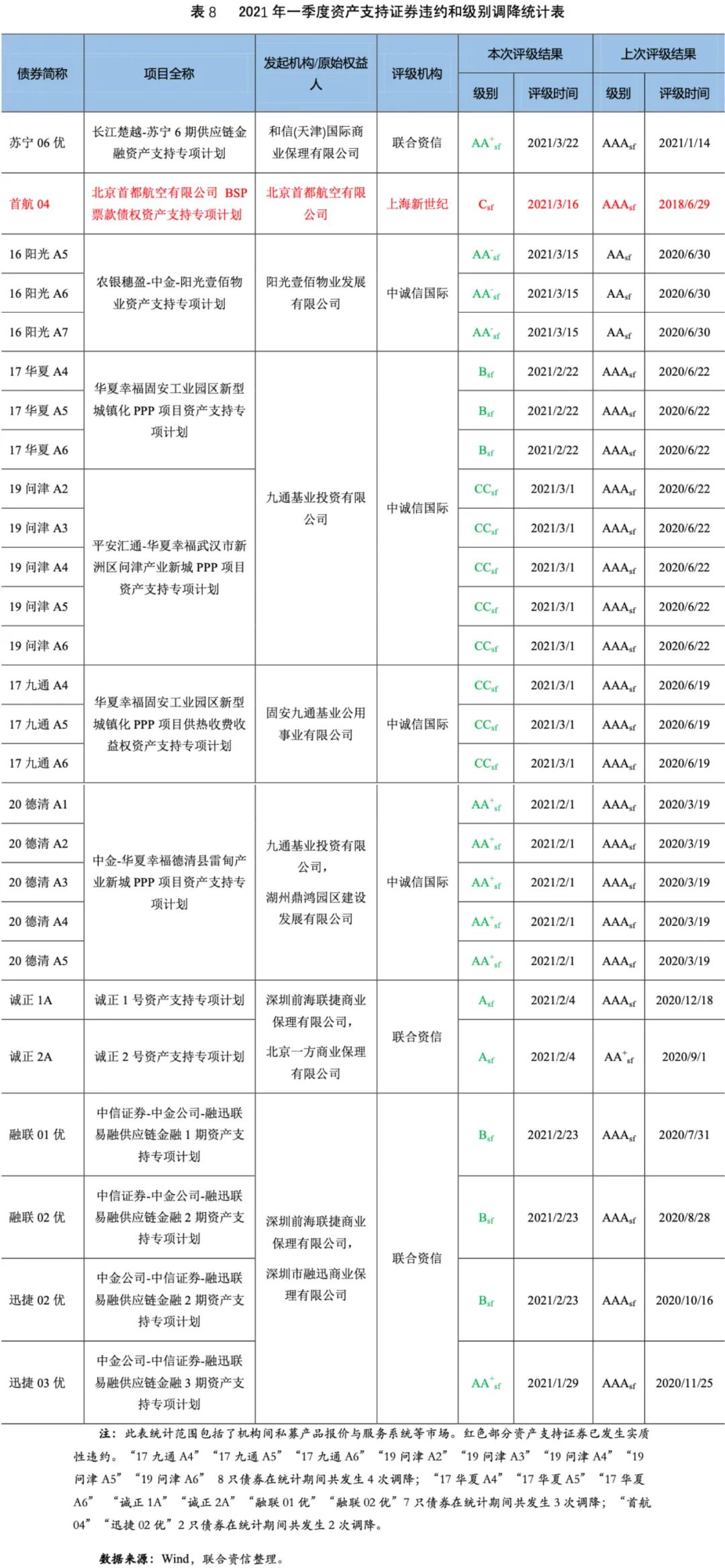 違約債券方面,市場(chǎng)共有1家原始權(quán)益人發(fā)起的1單1只資產(chǎn)支持證券首次發(fā)生違約。具體的違約債券為“北京首都航空有限公司BSP票款債權(quán)資產(chǎn)支持專(zhuān)項(xiàng)計(jì)劃”(債券簡(jiǎn)稱(chēng)“首航04”),該資產(chǎn)支持證券的發(fā)起機(jī)構(gòu)為北京首都航空有限公司,基礎(chǔ)資產(chǎn)類(lèi)型為客票收費(fèi),擔(dān)保人為海航集團(tuán)有限公司。該資產(chǎn)支持證券違約的原因主要是受到外部擔(dān)保人違約和新冠疫情沖擊的影響:一方面,該資產(chǎn)支持證券的擔(dān)保人海航集團(tuán)有限公司在2021年2月份開(kāi)始重整,主體信用等級(jí)調(diào)降至C級(jí);另一方面,2020年的新冠疫情對(duì)北京首都航空有限公司的經(jīng)營(yíng)業(yè)績(jī)?cè)斐闪藝?yán)重影響,公司財(cái)務(wù)狀況惡化,償債壓力增大。