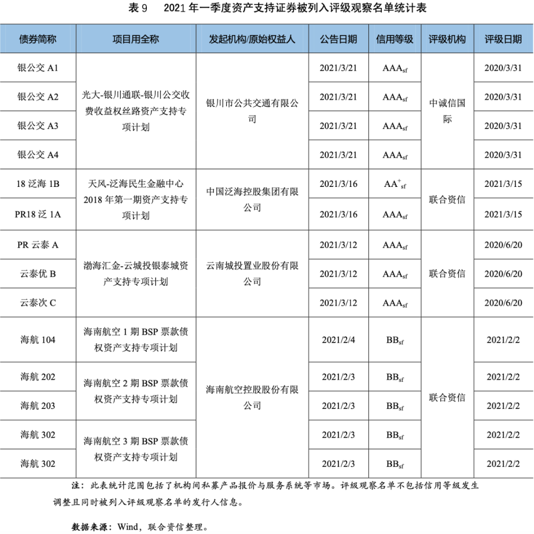 2021年一季度,債券市場(chǎng)上有1只資產(chǎn)支持證券首次發(fā)生違約[3](表10),同比未發(fā)生變化;27只資產(chǎn)支持證券信用評(píng)級(jí)下調(diào)[4],同比增加25只;14只資產(chǎn)支持證券被列入評(píng)級(jí)觀(guān)察名單[5](表11),同比增加10只。