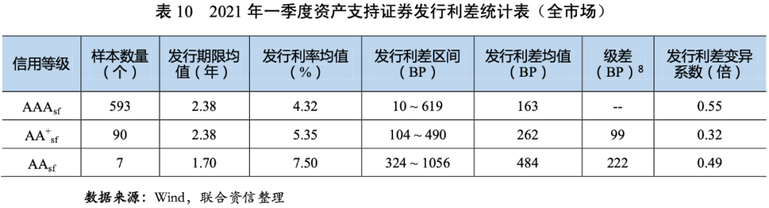 2021年一季度,資產(chǎn)支持證券的發(fā)行利率和利差均值均隨信用等級(jí)的下降而上升,說(shuō)明信用評(píng)級(jí)對(duì)資產(chǎn)支持證券的信用風(fēng)險(xiǎn)具有較好的區(qū)分度。AAAsf、AA+sf和AAsf級(jí)資產(chǎn)支持證券的發(fā)行利差均值分別為163BP、262BP和484BP,AAAsf、AA+sf和AAsf級(jí)資產(chǎn)支持證券的發(fā)行利差均值環(huán)比分別上升24BP、33BP和201BP;AAAsf級(jí)和AA+sf級(jí)資產(chǎn)支持證券的發(fā)行利差同比分別下降28BP和47BP,AAsf級(jí)資產(chǎn)支持證券的發(fā)行利差同比上升26BP。AAAsf級(jí)和AA+sf級(jí)、AA+sf級(jí)和AAsf級(jí)之間的級(jí)差分別為100BP和222BP,級(jí)差隨級(jí)別的下降而上升,反映了在經(jīng)濟(jì)恢復(fù)不均衡、貨幣政策回歸常態(tài)的背景下,市場(chǎng)不確定性上升,投資者對(duì)低級(jí)別資產(chǎn)支持證券要求的風(fēng)險(xiǎn)溢價(jià)進(jìn)一步提高。AAAsf級(jí)資產(chǎn)支持證券的發(fā)行利差的變異系數(shù)相對(duì)較高,說(shuō)明投資者對(duì)AAAsf級(jí)資產(chǎn)支持證券的信用風(fēng)險(xiǎn)判斷存在分化。