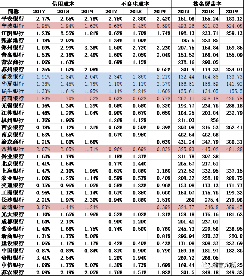 寧波銀行的信用成本(1.62%)遠大于不良生成率(0.59%),導致其撥備覆蓋率進一步上升至524.08%,表現(xiàn)出較強的風險管理能力,也是寧波銀行能在近兩年持續(xù)獲得估值溢價的體現(xiàn)。招商銀行、常熟銀行、郵儲銀行同樣如此。