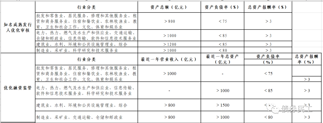 3、《優(yōu)化審核》明確了明確的資產(chǎn)總額、資產(chǎn)負債率和總資產(chǎn)報酬率等財務指標要求,去掉了營業(yè)收入指標。《優(yōu)化審核》和《優(yōu)化融資監(jiān)管》對于行業(yè)的設置是一致的,但是對于財務指標是不一致的,同時對于不同行業(yè)的財務指標也進行了一定的調(diào)整。