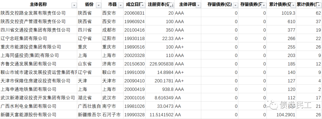 而在這些存量債券金額為零的城投公司發行人中,注冊資本超過100億元的有18家,其中注冊資本和實收資本最高的是上海申通地鐵集團有限公司,達到了938.80億元。