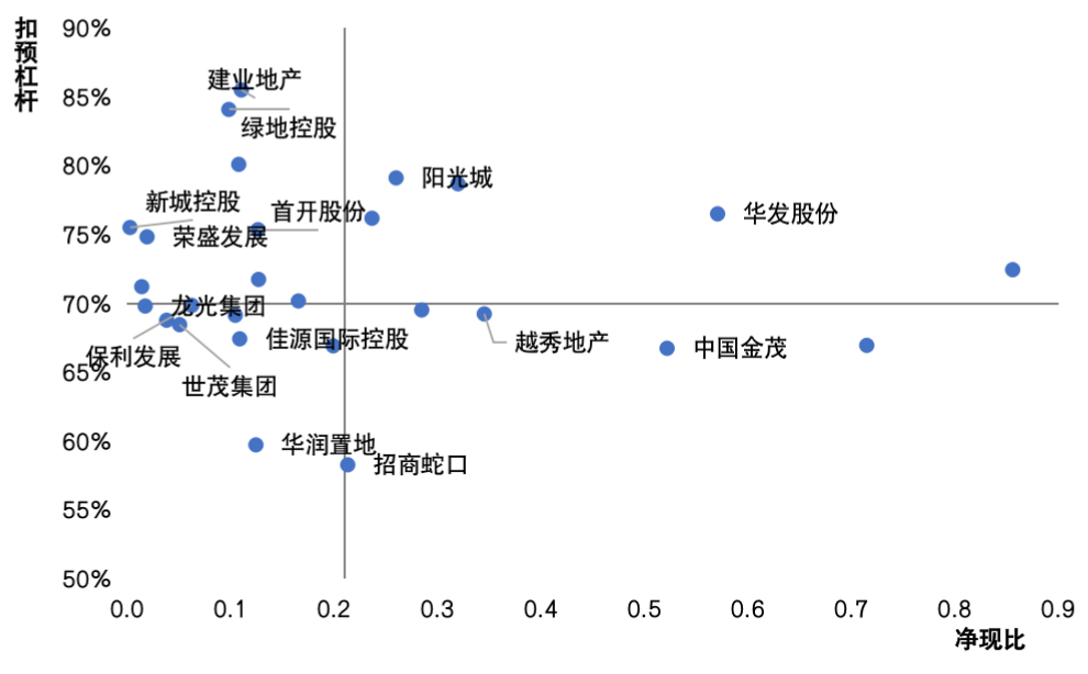 圖:27家房企2020年凈現(xiàn)比及扣預(yù)杠桿散點(diǎn)圖