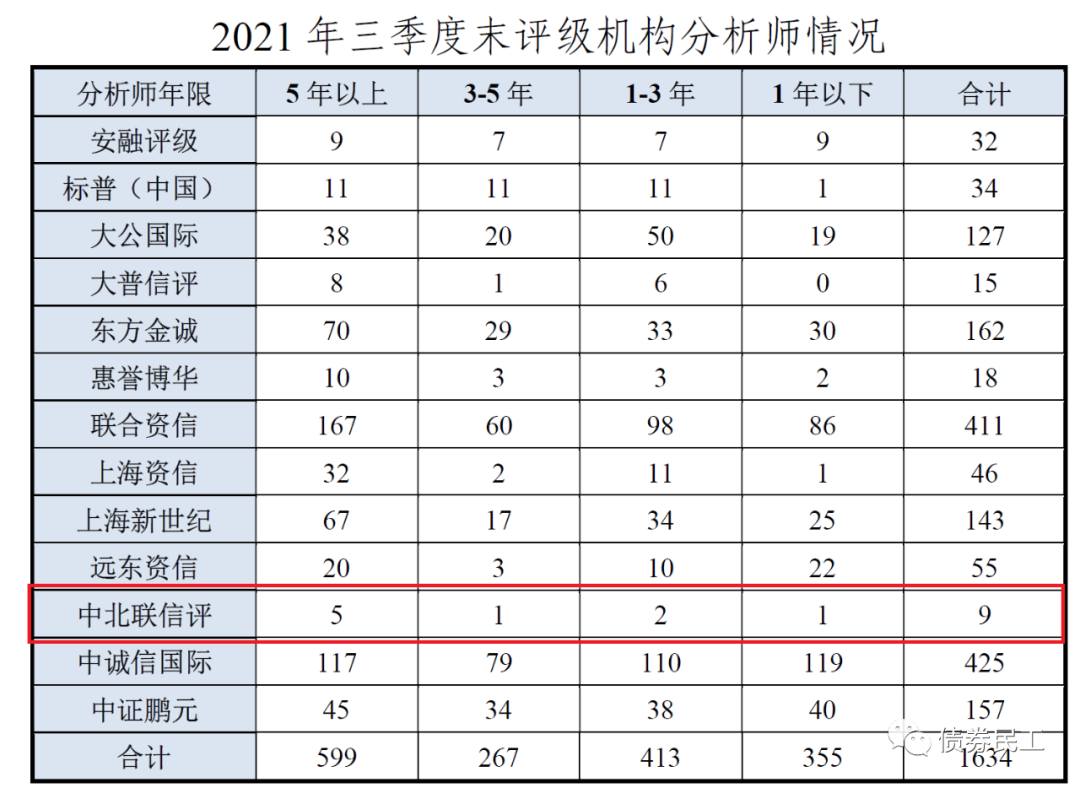 根據(jù)中國(guó)證券業(yè)協(xié)會(huì)和中國(guó)銀行間市場(chǎng)交易商協(xié)會(huì)于2021年12月3日對(duì)外發(fā)布的《2021年第三季度債券市場(chǎng)信用評(píng)級(jí)機(jī)構(gòu)業(yè)務(wù)運(yùn)行及合規(guī)情況通報(bào)》,在2021年第三季度中北聯(lián)信評(píng)暫無(wú)承攬債項(xiàng)情況(當(dāng)然公司可能已經(jīng)有簽署評(píng)級(jí)服務(wù)協(xié)議的項(xiàng)目或者在推動(dòng)的項(xiàng)目)。在2021年第三季度中北聯(lián)信評(píng)的分析師人數(shù)為9名。2021年四季度信用評(píng)級(jí)機(jī)構(gòu)運(yùn)行情況尚未出具,暫時(shí)無(wú)法了解中北聯(lián)信評(píng)最新的業(yè)務(wù)數(shù)據(jù)情況。