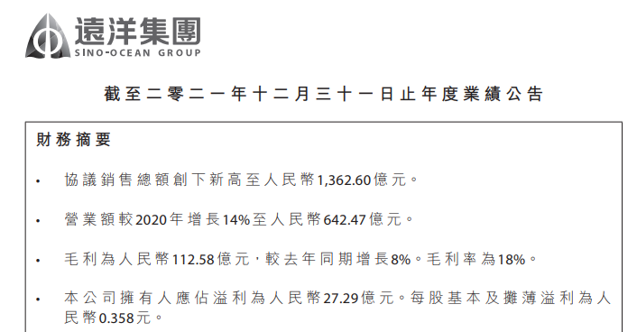 2021年,遠洋集團毛利112.58億元,較2020年上升8%。