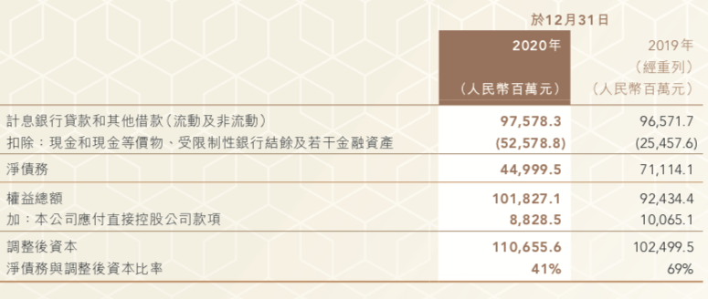 金茂年報里,沒有凈負債率具體數據,但有一個代替數據,稱為“凈債務與調整后資本比例”為41%,同比下降28個百分比。