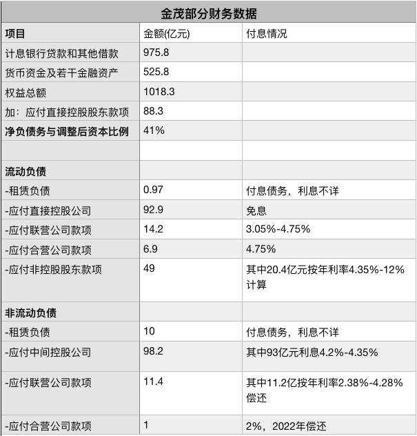 按照金茂年報的分列,金茂有息負債就是流動負債和非流動負債中的“計息銀行貸款及其他借款”,總計975.8億元。