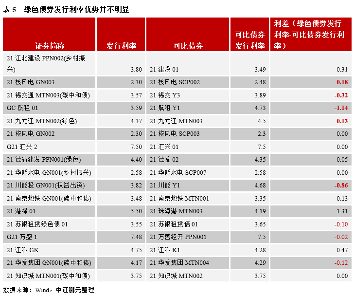 為了考察綠色債券是否具有利率優(yōu)勢,我們比較了綠色債券與其可比債券的發(fā)行利差,可比債券選擇標準為:同一發(fā)行主體、發(fā)行日期在一個月內(nèi)、債券發(fā)行期限相近。結(jié)果如表3所示,可以看出部分債券綠色貼標確實可以起到節(jié)約發(fā)行成本的作用,但是整體看,綠色債券發(fā)行利率優(yōu)勢并不明顯。事實上,債券的發(fā)行利率與發(fā)行時間、發(fā)行方式、發(fā)行期限等等多因素有關(guān),貼標綠色帶來的節(jié)約發(fā)行成本優(yōu)勢并不具有顯著效果,但是相比之下,貼標綠色債券在發(fā)行時,相比普通債券更易獲得投資者認購。