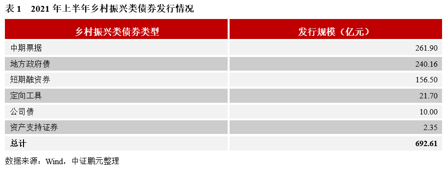 今年以來至2021年6月31日,債券市場鄉(xiāng)村振興類債券共發(fā)行692.61億元。從債券類型看,涵蓋了中期票據(jù)、地方政府債、短期融資券、定向工具、公司債和資產(chǎn)支持證券。其中,鄉(xiāng)村振興中期票據(jù)發(fā)行規(guī)模最大,為261.90億元,接下來是鄉(xiāng)村振興地方政府債(240.16億元)、鄉(xiāng)村振興短期融資券(156.50億元),其他類型發(fā)行量較少。