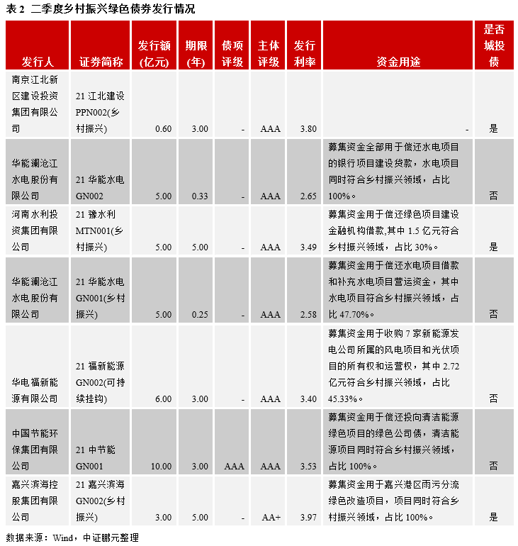 2021年3月以來,交易商協(xié)會、交易所相繼推出鄉(xiāng)村振興債券。2021年二季度發(fā)行的綠色債券有7只同時貼標鄉(xiāng)村振興債券。發(fā)行鄉(xiāng)村振興綠色債券,需要同時滿足鄉(xiāng)村振興認定和綠色認定,其中,鄉(xiāng)村振興債券的認定通過主承銷商盡職調(diào)查認定屬于鄉(xiāng)村振興類項目,參照的依據(jù)主要包括:2021年中央一號文件、國家鄉(xiāng)村振興局相關(guān)政策文件、發(fā)行人所在省市政府或鄉(xiāng)村振興主管部門政策文件。發(fā)行鄉(xiāng)村振興綠色債券,募集資金用途也需要同時滿足鄉(xiāng)村振興債和綠色債的要求,其中,鄉(xiāng)村振興債對募集資金用于鄉(xiāng)村振興項目的最低比例要求為30%。