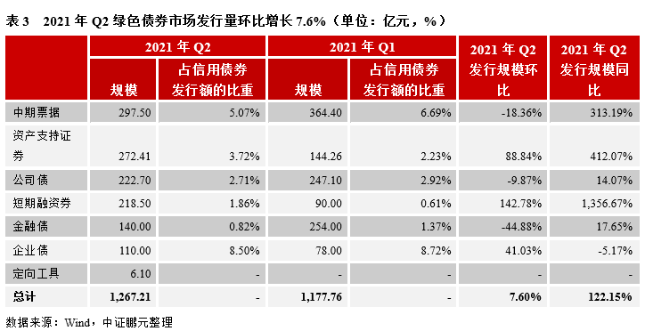 2021年Q2國內(nèi)市場共發(fā)行綠色債券1,267.21億元,環(huán)比增長7.60%,同比增長122.15%。分債券類型看,2021年Q2綠色債券發(fā)行量最大的依然是中期票據(jù),發(fā)行了297.50億元;其次是資產(chǎn)支持證券,發(fā)行規(guī)模為272.41億元,接下來依次是公司債(222.70億元)、短期融資券(218.50億元),其余品種發(fā)行規(guī)模在150億元以下。環(huán)比來看,綠色短期融資券、綠色資產(chǎn)支持證券、綠色企業(yè)債環(huán)比增幅明顯,綠色中期票據(jù)環(huán)比下降18.36%,綠色金融債、綠色公司債發(fā)行規(guī)模環(huán)比也均有下降。同比來看,除綠色企業(yè)債外,其余綠色債券品種均有增長,綠色短期融資券、綠色資產(chǎn)支持證券、綠色中期票據(jù)同比增長幅度較大。