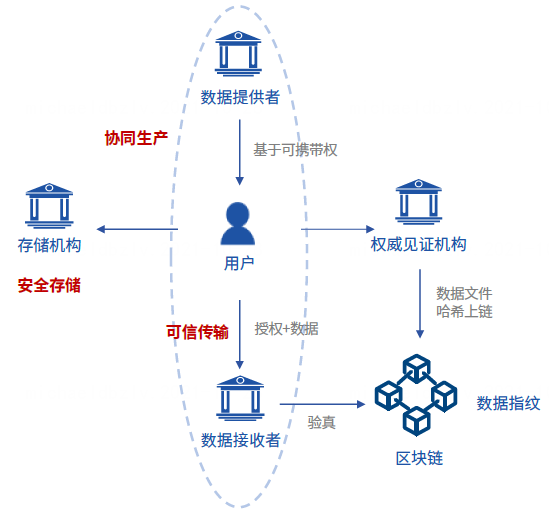 第一步是用戶從數(shù)據(jù)提供者處下載個人信息數(shù)據(jù),并存儲在個人指定的位置。存儲位置可以是本地,也可以是云或其它位置。為了確保個人真實意愿、防止真實數(shù)據(jù)被篡改、保持傳輸給接收者的個人信息與提供者提供的個人信息一致,經(jīng)用戶授權(quán)后,可進(jìn)一步引入權(quán)威中立的第三方機(jī)構(gòu)參與見證該個人數(shù)據(jù)文件的傳輸過程,并獲取相關(guān)文件的哈希值(而非源文件)作為“數(shù)據(jù)指紋”存儲于區(qū)塊鏈上。第二步是用戶將已下載的個人信息數(shù)據(jù)傳輸給數(shù)據(jù)接收者,并對使用范圍和使用目的等進(jìn)行授權(quán)。數(shù)據(jù)接收者在收到個人信息數(shù)據(jù)文件之后,可以將該文件與此前存儲于區(qū)塊鏈上的“數(shù)字指紋”進(jìn)行比對,從而完成驗真的過程。與此同時,個人的所有授權(quán)記錄、數(shù)據(jù)接收者的具體使用情況也皆可在鏈上進(jìn)行記錄,便于個人未來追溯相關(guān)文件的流轉(zhuǎn)。