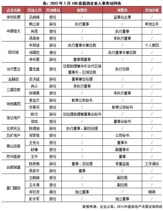 1月,房企高層人事動態信息數量較前一月有所減少,從108家監測企業的人事變動情況來看,房企對組織架構的調整、管理層重組都有所減緩。