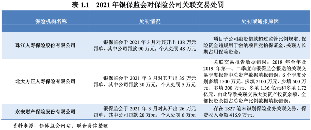 近年來,保險機構資金運用關聯交易違規事件時有發生,且隱蔽性及復雜性均有所加劇,2021年以來,銀保監會持續加強保險機構關聯交易監管工作,并對違規主體進行一定的處罰與通報。2021年,銀保監會網站披露珠江人壽保險股份有限公司、北大方正人壽保險有限公司以及永安財產保險股份有限公司行政處罰決定書(見表1.1);2022年4月,銀保監會下發了《關于銀行保險機構股權和關聯交易監管信息系統數據質量突出問題的通報》(以下簡稱“《通報》”),《通報》指出,銀行業保險業關聯交易監管系統于2020年9月上線運行,其中4家保險機構因數據報送不及時或數據填報不準確遭點名。
