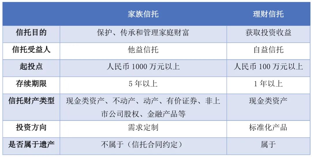 根據(jù)《銀保監(jiān)37號文》以及監(jiān)管部門的要求,家族信托業(yè)務(wù)需要滿足以下三個要求:首先是投資起點要求,家族信托財產(chǎn)價值不低于人民幣1000萬元;其次是受益人要求,家族信托是他益信托,受益人應包括委托人在內(nèi)的其他家庭成員,委托人不得為唯一受益人;最后是家族信托的目的要求,家族信托不得單純追求保值增值,應當以家庭財富的保護、傳承和管理為主要信托目的。家族信托不同于普通資金理財型信托,區(qū)別如下: