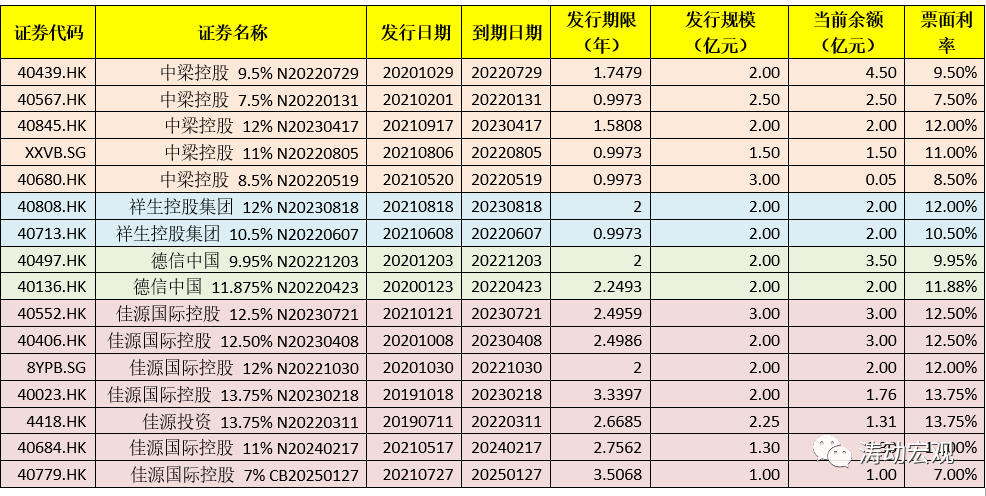 1、中梁:5只美元債,規(guī)模10.55億美元,融資成本平均為9.70%