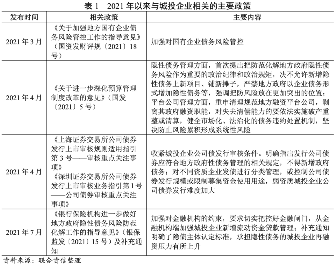 2021年以來,國發(fā)〔2021〕5號文、滬深交易所公司債發(fā)行上市審核指引、銀保監(jiān)發(fā)〔2021〕15號文及補充通知等政策相繼出臺,對地方政府隱性債務保持高壓監(jiān)管態(tài)勢,城投企業(yè)融資政策整體收緊。