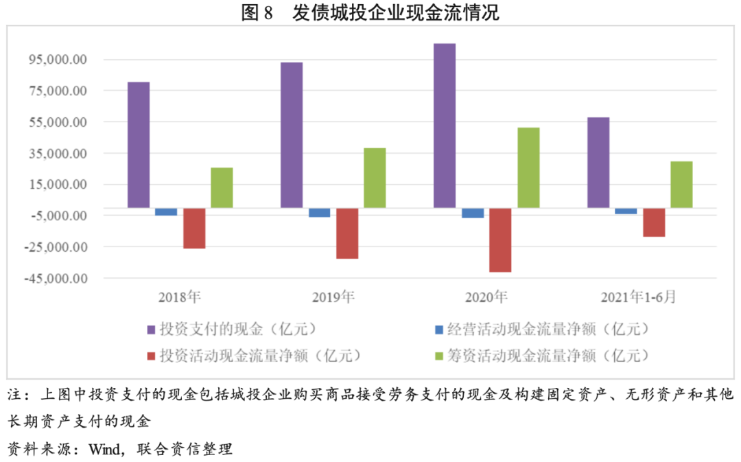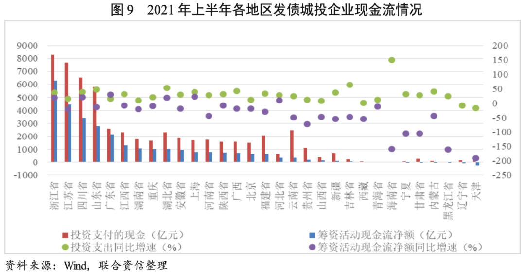 城投企業(yè)保持基礎設施建設投資力度,但不同地區(qū)基建投資增速有所分化。2021年上半年,城投企業(yè)投資力度加大,但凈融資規(guī)模收縮,資金壓力整體上升。