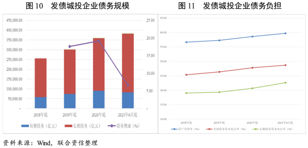 截至2021年6月底,發(fā)債城投企業(yè)有息債務規(guī)模超38萬億元;但隨著地方政府隱性債務監(jiān)管及城投企業(yè)融資政策趨嚴,城投企業(yè)債務增速較之前年度明顯放緩。與此同時,隨著債務的逐步置換,短期債務占比下降至21.70%。從債務負擔來看,發(fā)債城投企業(yè)負債水平持續(xù)提升,債務負擔加重。