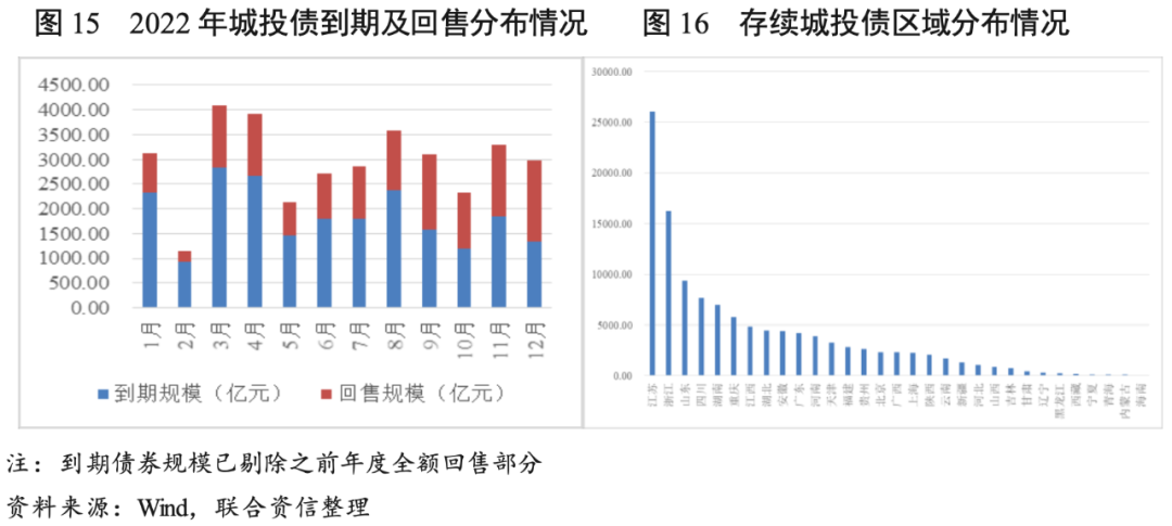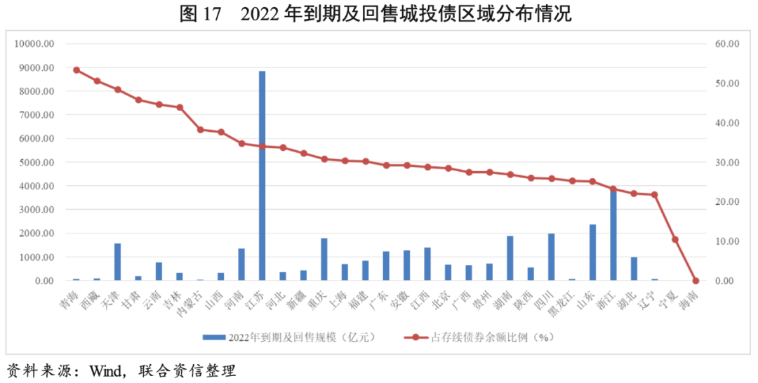 從存續(xù)城投債到期規(guī)模來看,假設含回售選擇權的債券全額回售,2022年城投債到期及回售規(guī)模合計35260.99億元,償債壓力明顯大于2021年(約27000億元)。從兌付時間分布來看,2022年3月、4月和8月城投債到期及回售規(guī)模超過3500億元,集中償付壓力較大。區(qū)域方面,需重點關注天津、甘肅、云南等地城投債兌付壓力,并重點關注短期償債壓力大及出現(xiàn)逾期、欠息、擔保代償、非標逾期等負面事件尾部城投企業(yè)的信用風險。