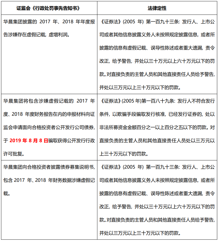 如何建立因果關系是一門學問, 而證監會認為的發行人涉嫌騙取獲得公開發行行政許可批復的違法違規行為直接為投資人確立了一條最為強有力的因果關系。對于發行在2019年8月8日之后的公開發行的19華集01、20華集1債券持有人而言, 其可直接主張“如果發行人如實披露了財務數據, 沒有財務造假, 發行人就無法獲得證監會的行政許可, 也不可能發行19華集01、20華集1債券; 那么投資人不可能買到該兩只債券, 當然不會有損失”。顯然該等因果關系是強于那些在募集說明書中引用虛假財務數據的債券, 例如20華晨01, 該等債券持有人仍需循規蹈矩地討論和論證發行人在募集說明書中的虛假陳述行為是如何影響其對發行人的償債能力的判斷。當然, 虛假陳述行為與損失間的因果關系最弱的, 當屬僅發生在債券受托管理期間的虛假陳述行為了。