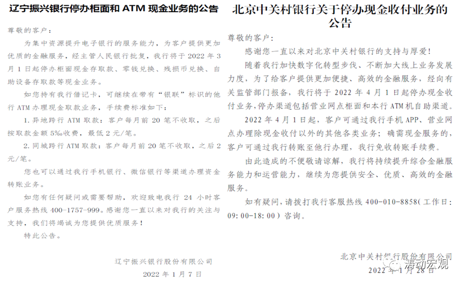 具體看,2022年1月7日,遼寧振興銀行發(fā)布《停辦柜面和ATM現(xiàn)金業(yè)務的公告》,明確自2022年3月1日起將停辦柜面現(xiàn)金存取款、零錢兌換、殘損幣兌換、自助設備存取款等現(xiàn)金業(yè)務。隨后1月28日,北京中關村銀行亦發(fā)布《關于停辦現(xiàn)金收付業(yè)務的公告》,明確自2022年4月1日起停辦現(xiàn)金收付業(yè)務,停辦渠道包括營業(yè)網點柜面和本行ATM機自助渠道。