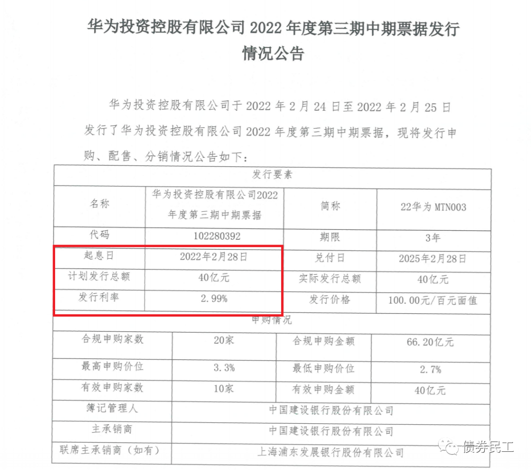 根據(jù)華為投資控股有限公司(以下簡(jiǎn)稱“華為投資”)于2022年2月28日公告的發(fā)行情況公告,發(fā)行金額為40億元的“22華為MTN003”成功發(fā)行,發(fā)行利率為2.99%!本期中期票據(jù)的起息日是2022年2月28日,債券期限為3年。
