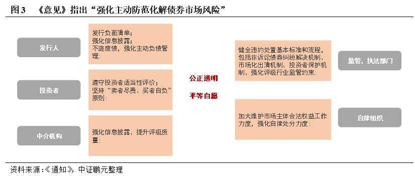 隨著我國債券市場的發展,完善投資者保護及市場風險化解迫在眉睫。《意見》在前期政策的基礎上,將制度整合,構建出較為清晰的頂層設計,對債券發行、存續期、違約后進行全周期管理,覆蓋發行人、中介機構、自律組織、監管和執法機關等參與主體?!兑庖姟窂娬{,要把主動防范化解債券市場風險放在更加重要的位置,筑牢市場準入、早期干預和處置退出三道防線,健全風險監測預警機制。維護債券違約處置過程公正透明、平等自愿,充分保障投資者合法權益。本文認為,主動風險管理制度包括各參與方的日常風險識別和跟蹤制度、債務管理工具(包括現金要約收購、債券置換等)、風險處置制度等。隨著覆蓋債券存續期的風險管理制度的完善,將為風險定價奠定基礎。