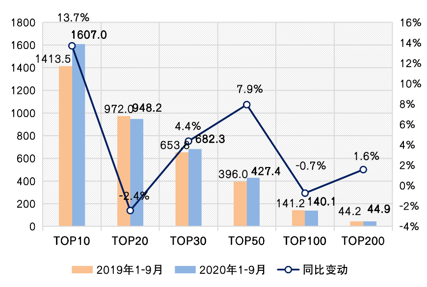 備注:操盤金額集中度=入榜房企操盤銷售金額/統計局公布的全國商品房銷售金額,其中,2020年前三季度全國商品房銷售金額是根據前8月累計同比增幅推算9月同比增幅所得。