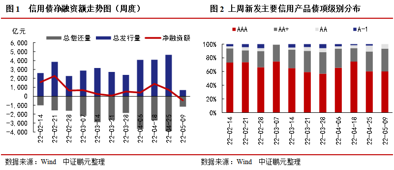 1.上周信用債發(fā)行699.03億元,凈償還460.37億元,分別較前一周下降85%和163%