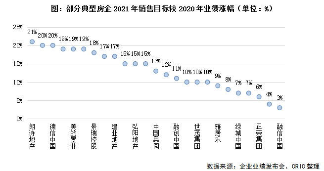 從近30家上市房企在業(yè)績(jī)發(fā)布會(huì)披露的2021年銷售目標(biāo)來(lái)看,整體目標(biāo)增幅有所放緩,近三成上市房企2021年的業(yè)績(jī)目標(biāo)預(yù)增低于10%,可以看出在杠桿紅利消失后,企業(yè)發(fā)展以穩(wěn)健、提質(zhì)增效為主。