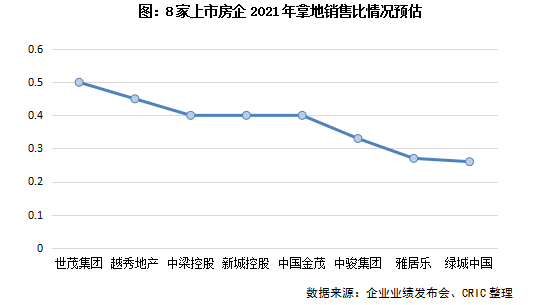 從部分公布了2021年投資預(yù)算的房企來(lái)看,不同房企的拿地銷售比有較大的差異:世茂、中梁等房企提出將按銷售的50%和40%比例來(lái)控制拿地,而金茂的預(yù)期的全口徑投資金額為千億左右,整體拿地銷售比達(dá)到0.4。