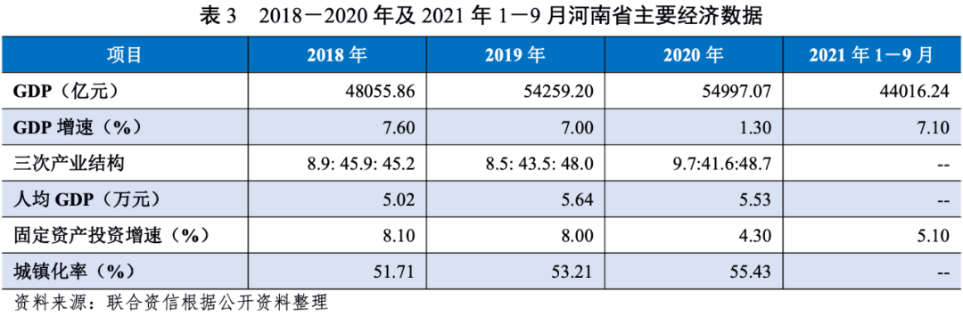河南省位于我國中東部、黃河中下游,是全國重要的交通樞紐和物資集散地,人口資源豐富,經(jīng)濟(jì)發(fā)展水平較好,2018-2020年河南省經(jīng)濟(jì)總量居全國前列,人均GDP排名全國中下游。2018-2020年,河南省經(jīng)濟(jì)增速及固定資產(chǎn)投資增速均有所放緩,但產(chǎn)業(yè)結(jié)構(gòu)持續(xù)優(yōu)化,經(jīng)濟(jì)發(fā)展態(tài)勢良好。2021年以來,受洪澇災(zāi)害和“新冠”肺炎疫情影響,前三季度主要經(jīng)濟(jì)指標(biāo)增速出現(xiàn)不同程度回落。