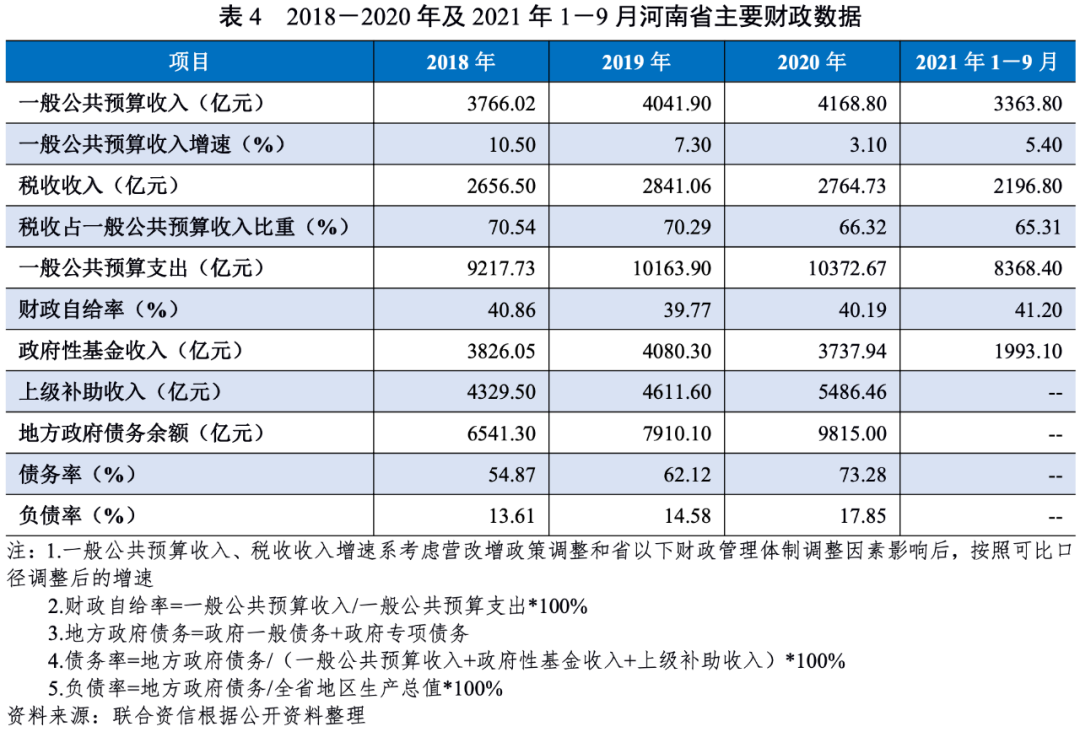 河南省位于我國中東部、黃河中下游,是全國重要的交通樞紐和物資集散地,經(jīng)濟(jì)發(fā)展水平較好,近年來經(jīng)濟(jì)總量居全國前列,人均GDP排名全國中下游。2018-2020年,河南省經(jīng)濟(jì)增速及固定資產(chǎn)投資增速均有所放緩,但產(chǎn)業(yè)結(jié)構(gòu)持續(xù)優(yōu)化,經(jīng)濟(jì)發(fā)展態(tài)勢良好。2021年以來,受洪澇災(zāi)害和“新冠”肺炎疫情影響,前三季度主要經(jīng)濟(jì)指標(biāo)增速出現(xiàn)不同程度回落。2020年,河南省一般公共預(yù)算收入全國排名第八位,一般公共預(yù)算收入穩(wěn)定性較強但財政自給能力一般,政府性基金收入和上級補助收入是河南省綜合財力的重要支撐。2020年,河南省政府負(fù)債率和債務(wù)率在全國各省(自治區(qū)、直轄市)中分別排名第5位和第6位,政府負(fù)債水平相對較低,債務(wù)負(fù)擔(dān)尚可。