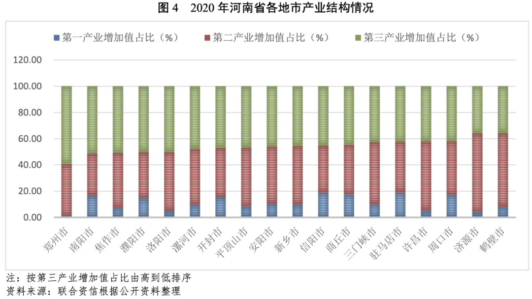 從產(chǎn)業(yè)結(jié)構(gòu)來看,鄭州市、南陽市、焦作市、濮陽市和洛陽市第三產(chǎn)業(yè)對經(jīng)濟(jì)拉動作用較大,第三產(chǎn)業(yè)增加值占比均超過50.00%,其中鄭州市第三產(chǎn)業(yè)增加值占比為59.00%,居全省首位;漯河市、開封市、平頂山市等11個地市第三產(chǎn)業(yè)增加值占比介于40.00%~50.00%之間,其中,駐馬店市、信陽市、商丘市、周口市和開封市第一產(chǎn)業(yè)增加值占比相對較高,均在15.00%以上;濟(jì)源市和鶴壁市第三產(chǎn)業(yè)增加值占比較低,分別為35.80%和35.60%,上述2個地市第二產(chǎn)業(yè)較為發(fā)達(dá),第二產(chǎn)業(yè)增加值占比分別為60.00%和56.40%,位列全省第一和第二。