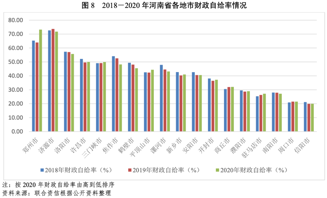 財政自給率方面,2020年,鄭州市財政自給率最高,為73.20%,除鄭州市和濟(jì)源市以外,其他地市財政自給率均在60%以下,其中信陽市最低,僅為19.96%。從財政自給率變化情況來看,2018-2020年,除鄭州市、三門峽市、平頂山市、商丘市、駐馬店市和周口市以外,其他地市財政自給率均呈現(xiàn)不同程度下降。總體看,河南省各地市財政自給率差距較大,財政自給能力整體較弱。